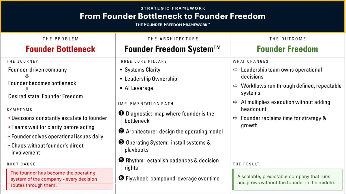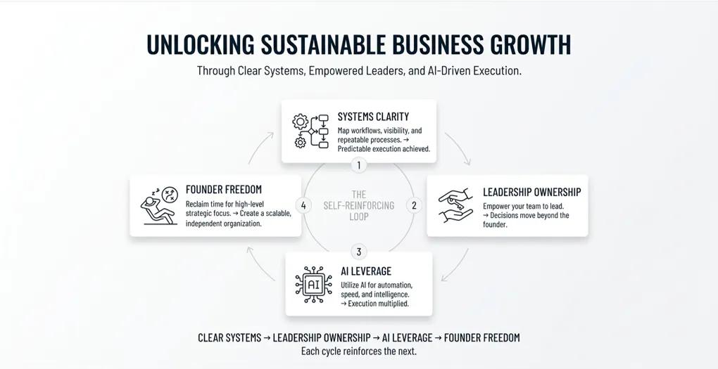 We help founder-led companies between $3M and $20M that need more freedom, less friction, increased/create leadership capacity, and we implement AI that actually works inside the business.